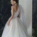 Satin-pink signature bowtie on the back of my tulle dress, and flower petals arranged to counter my dismay